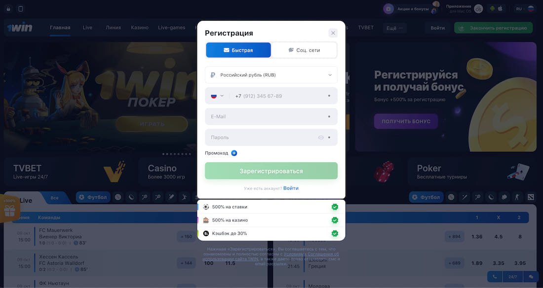 Здесь можно зарегистрироваться на официальном сайте букмекерской конторы, чтобы играть на деньги и делать ставки в БК. При этом уже в момент регистрации можно ввести промокод, чтобы получить специальный бонус. Достаточно большим преимуществом тут выступает бонус при пополнении первого депозита. Когда пользователь в первый раз вносит деньги на игровой счет, то он может получить +500% от внесенной суммы. Стоит отметить, то максимальная сумма зачисления на бонусный счет составляет 1200 долларов.
